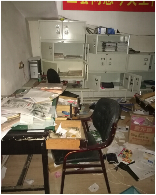 金城保险柜公司员工被“清理”之后,强拆人员开始“清场”:所有办公室的门均被撬开,文件资料一片狼藉,营业厅的保险柜给洗劫一空,不值钱的直接砸毁,值钱的、拿得动的直接拿走,值钱的拿不动的,一样砸毁,油漆满地倒、所有设备被破坏一空,然后“清场”人员满载而归!