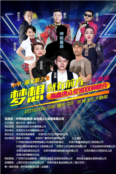 “中甲•派宝源之夜”梦想就在前方海鑫携众星巡回演唱会东莞站将于2016年8月8日晚8时在东莞玉兰大剧院正式开唱,届时将有星光大道年度亚军王旭、中国内地女歌手胡扬琳、星光大道最受欢迎女歌手方小菲、“花儿朵朵”红歌榜赛区”全国总决赛冠军郝亚青、“百变歌王”蒙克、中国鸟叔第一人金正浩、实力唱作歌手罗艺达等明星倾力助阵。