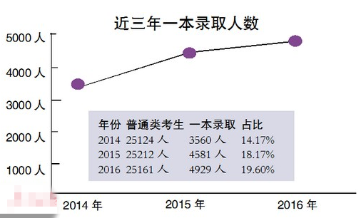 记者对比近三年数据发现,东莞每年普通类考生人数稳定在25000人左右,而一本录取人数每年都在增加,一本录取率也是节节攀升。