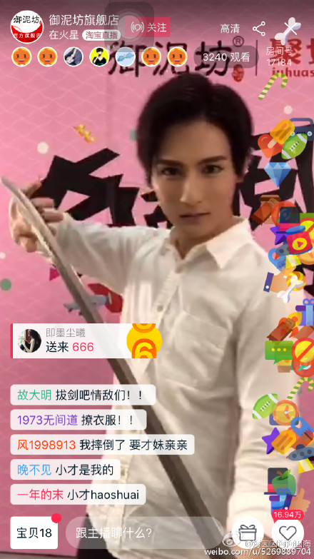 在御泥坊直播期间,黄靖翔利用coseplay的刀剑道具摆出各种古典造型,面部分明的棱角让众多收看直播的粉丝们狂刷评论。
