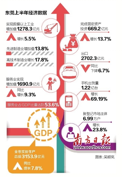 据透露,上半年全市实现生产总值3153.9亿元,同比增长7 .8%,增速分别比全国、全省快1.1和0 .4个百分点;新增新三板挂牌企业55家,总量达118家,总量排全省地级市首位、全国地级市第三;市场主体总量、企业数量、企业注册资本分别占全省的9.2%、9.1%、4.5%,均居全省地级市第一……这些数据,不仅反映了当前经济向好态势,也表明东莞多项经济数据已经由前几年的全省平均线以下上升到了全省平均线以上。