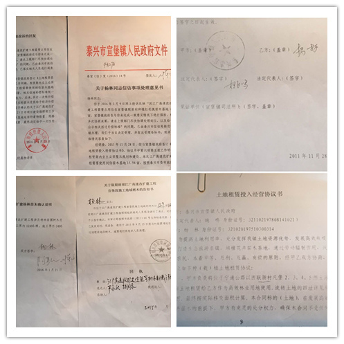 杨林说,他2011年11月28日和泰兴市宣堡镇政府签订265亩土地的《租赁投入经营合同》,约定每年租金26.5万元,一年一交,此后的几年,为了正常经营杨林从未差过或者延迟支付租金(注:2015年宣堡镇政府未让交租金)。