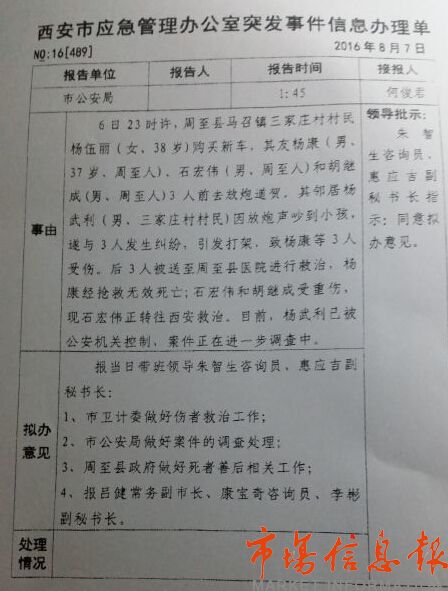 8月7日,周至县公安局信息快报显示,(8月)6日23时许,马召镇三家庄村民杨伍丽购买新车,其友胡某成、杨某、石某伟同去为其放炮道贺。杨伍丽西邻杨武利因放炮产生噪音吵到小孩,前去制止,遂发生纠纷,引发打架。致胡某成、杨某死亡,石某伟重伤,已转至省级医院治疗。