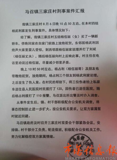 同日,马召镇政府也出具了一份情况说明,内容显示:杨伍丽购买新车在自家门口放炮祝贺,东邻杨武利因炮声大家里婴儿受惊,到去说理并打了杨伍丽丈夫。晚上10时50分,杨占利(杨伍丽哥哥)及朋友也带鞭炮祝贺,放炮期间,杨占利的三个朋友到杨武利家论理,之后发生了伤人案,村民帮助伤者送往医院,杨占利拨打110报警,马召派出所出警介入调查。
