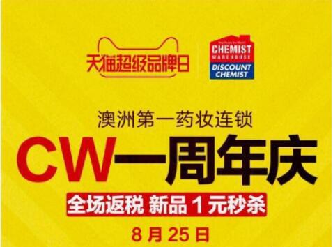 为回馈广大中国朋友对ChemistWarehouse的支持与关注,ChemistWarehouse海外旗舰店在一周年店庆之际将携手天猫共同推出超级品牌日活动。此次活动活动从8月25日至8月27日,为期3天。ChemistWarehouse旗下几乎所有的产品尽数参加,目前预售活动正在火热进行中。