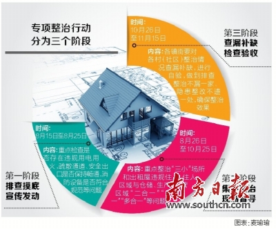 第一阶段主要是排查摸底、宣传发动阶段。各镇街要组织多方力量,对所有“三小”场所和出租屋逐家逐户进行排查,重点检查是否存在违规用电用火,疏散通道、安全出口是否保持畅通,消防设备是否符合规范等问题隐患。 第二阶段开始,各镇街要对排查发现的隐患问题,严格执行省政府下发的整治标准和要求,不打折扣、不降标准,专人负责,逐家逐项整改,确保整改质量。重点整治“三小”场所和出租屋违规住人,住人区域与仓储、生产、经营区域“二合一”、“三合一”、“多合一”。对“三小”场所的木质阁楼、出租屋使用易燃可燃装修材料改建的“房中房”予以强制拆除。 第三阶段是查漏补缺、检查验收阶段。由市消防安全委员会组织检查验收组,对各镇街“三小”场所、出租屋消防安全专项整治行动进行检查验收。