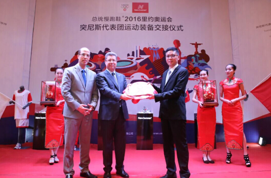 6月26日,总统慢跑鞋专为突尼斯代表团量身定制的奥运会运动装备隆重发布,突尼斯奥委会主席迈赫雷兹·博赛因(Mehrez Boussayene)、突尼斯驻华大使塔雷克·阿姆里(Tarek Amri)莅临公司总部,出席总统慢跑鞋品牌2016里约奥运会突尼斯代表团运动装备交接仪式。