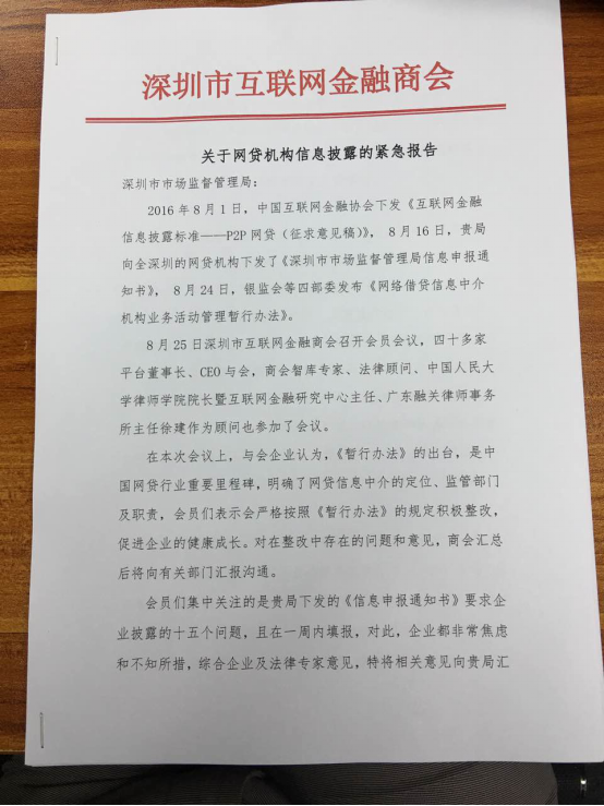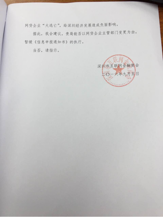 9月5日,深圳互联网金融商会称,8月16日深圳市场监督管理局向全市网贷机构下发《深圳市场监督管理局信息申报通知书》,该《通知书》要求网贷机构披露的问题均可能涉及刑事犯罪,并建议深圳市场监督管理局以网贷企业主管部门变更为由暂缓《信息申报通知书》的执行。