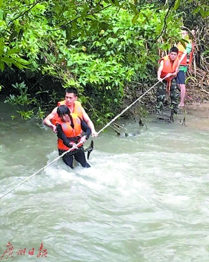 据了解,由于当时暴雨来得非常突然,正在森林公园行山的一家三口在下山途中遇上了涨满河水的溪流,情况变得危急。消防大队救援人员观察现场情况后,出动一台抢险救援车,五名指战员赶赴现场实施营救。指挥员果断采取利用绳索横渡方案来营救被困人员,将三人逐一救出。(来源:广州日报)