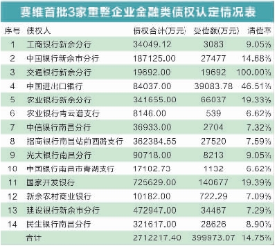 记者获悉,根据当时的方案,光伏硅、高科技、高科技(新余)3家公司涉及金融类债权合计271.2亿元。其中,全面支持光伏行业发展的国开行涉及债权72.6亿元,建行涉及债权47.3亿元,招行、农行、民生银行(9.320, -0.01, -0.11%)均逾30亿元。据管理人通报,光伏硅普通债权清偿率约为11.5%,高科技为6.6%,高科技(新余)为3.4%。
