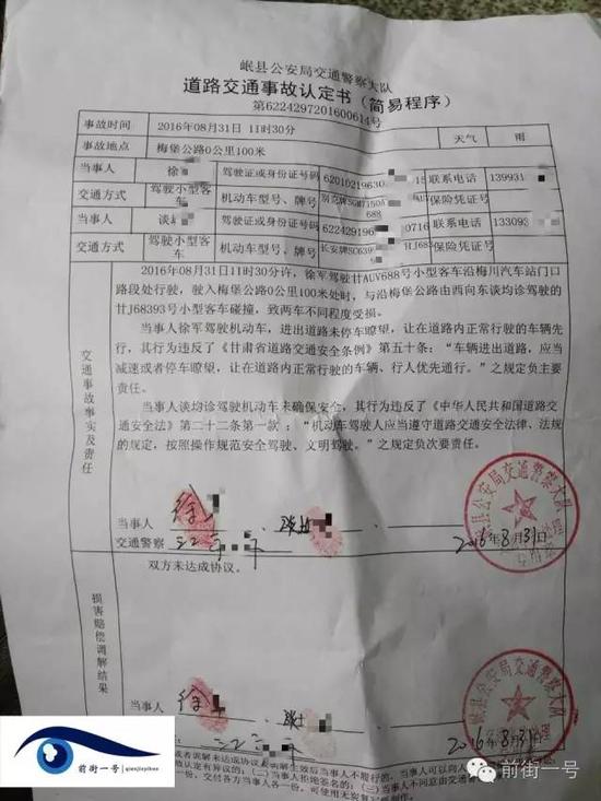 当晚7点左右,岷县交警大队事故大厅出具了道路交通事故认定书。“我被认定为承担主要责任,但想早点赶回兰州,还是在认定书上签了字”。徐先生称,他签字时工作人员告诉他已经通知了面包车司机,面包司机很快就来。“我们等了好久,面包车司机并没有来,之后梅川中队那位女工作人员来了,并在认定书上签了面包车司机的名字,还摁了手印”。