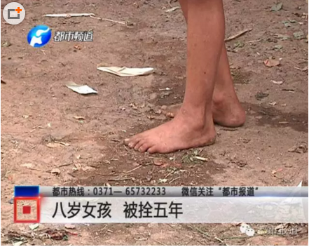 被拴的女孩叫紫怡,被拴在自家屋前的的一棵树藤上。光着脚,身上脏兮兮的。