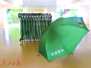 昨日,记者前往松湖莞中,在学校南门门岗、宿舍大门值班室、至贤楼宿舍楼架空层等3处,看到了家长所摆放的雨伞。其中,前两处分别放置了一个伞架,后一处放置了2个伞架,每个架子上分别有24把绿色雨伞。令人倍感温馨的是,每把伞上还印上了“松湖莞中”的字样,与此同时,该名家长还在伞架旁的墙边,贴上了“爱心雨伞,素质保管。谁拿随用,诚信归还”的标语。