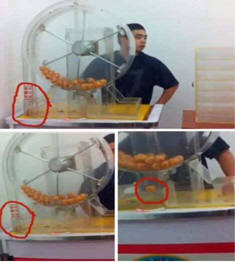 视频截图3:第二次开标的球池中奇怪地同时出现了两个号码球。