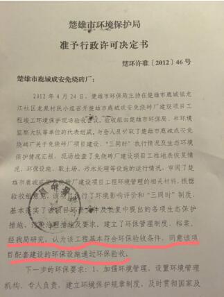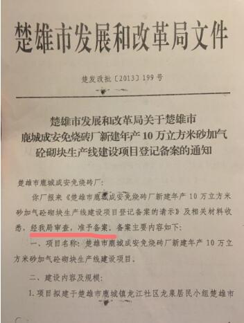 而聂成安亲属却向记者出示了该厂的相关合法经营手续,其分别为:楚雄市发改局于2013年6月9日下发的 “楚发改批【2013】199号”文件,批示“准予备案建设砖厂”;楚雄市环保局于2012年5月18日下发“楚环许准【2012】46号文,同意该项目配套建设的环保设施通过环保验收”;楚雄市规划局于 2004年5月12日也颁发了【(2004)工程000126】“建设工程规划许可证”。表示本建设工程符合城市规划要求,准予建设。除此之外,聂成安亲属还向有关媒体出示了其多个经营实体的工商营业执照、税务登记证、组织机构代码证等相关手续。媒体记者也到相关发证部门一一核实,其所提供的批文及证件均属实。