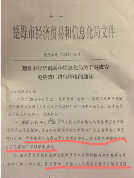 多个事实证明,楚雄当地政府对成安免烧砖厂的拆除是为了尽快推进义乌商品博览城项目的建设。2016年6月28日,楚雄市经济贸易和信息化局下发“楚经信通【2016】12号”文件,责令楚雄鹿城供电局依法按程序对成安免烧砖厂采取停电措施。记者注意到,该通知中提到,对成安免烧砖厂进行停电是配合西南(楚雄)义乌商品交易博览城项目建设指挥部。