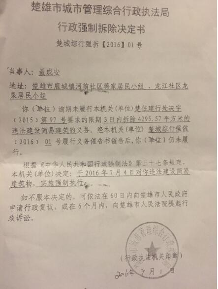 楚雄市综合执法局7月1日下发的行政强拆决定书