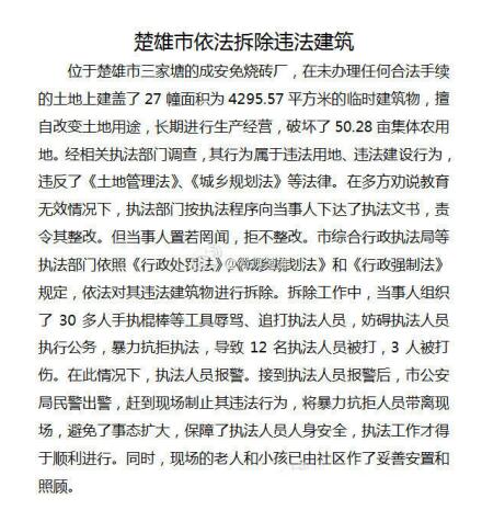 楚雄官方“微观楚雄”微信号发布的“楚雄市依法拆除违法建筑”(三家塘成安免烧砖厂)情况通报显示:“成安免烧砖厂在未办理任何合法手续的土地上建盖了27幢面积为4295.57平方米临时建筑,长期从事经营活动。市综合执法局等执法部门依法对其建筑物进行了拆除。”