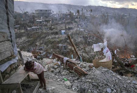 10月10日,在海地热雷米,一名儿童在废墟旁休息。(联合国儿童基金会供图)
