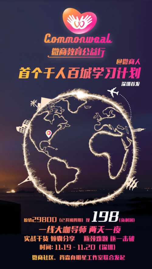 微商教育公益行首个千人百城学习计划,一个有专业、有爱心、有态度的公益活动,不空谈,切实用实际推动,办好每一场活动,换一份耕耘收获,与所有微商人一起推送微商行业健康、阳光、可持续发展。