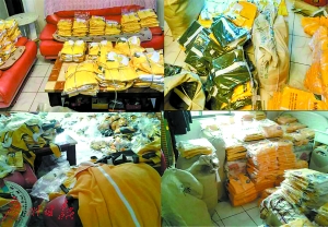 前天下午,记者根据上述地址来到出售者的家,她家大门上贴有一张“告示”:“如需购买小学校服,本人不在家时,请拨打电话137××××××××预约时间来买。”她家门口还放了一个编织袋,袋上布条写着“东莞黄江小学”“运动裤”“130-140”等字样。