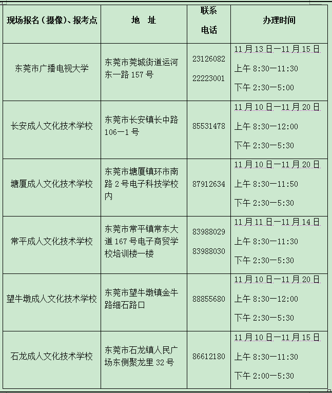 东莞市自考现场报考点时间安排表