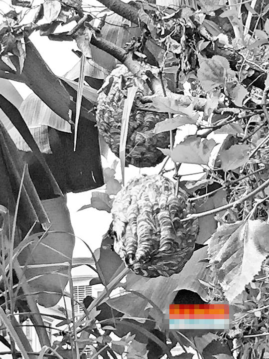 方先生介绍,马蜂窝长在一棵野生的桑枣树上,4个都如篮球般大小。两个在树的左边,一个在右边,还有一个高高挂在树顶上。蜂洞隐约可见,不少黄黑色、如手指头大小的马蜂正在忙碌地从蜂窝中飞进飞出。