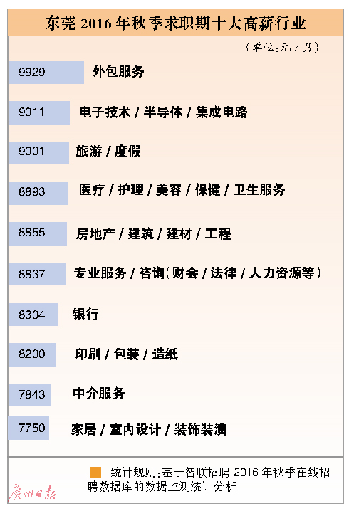 《报告》称,东莞地区秋季求职期的平均薪酬为税前7314元,在全国34个主要城市中排名第6位。外包服务的平均月薪最高,为9929元。值得一提的是,银行业的平均薪酬在秋季求职期再度下滑,从今年夏季的8896元降到8304元,排名也从第五位降到第七位。而旅游/度假业平均薪酬飙升至第三,仅次于外包服务和电子技术/半导体行业。