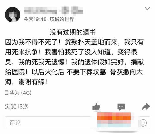 据了解,网名为“缤纷的世界”的熊女士在樟木头打工,一直是单身一人居住,最近因为工作压力以及自身经济上出现了一些状况,使得她有了厌世情绪,当晚在家中上网时,就在Q Q空间留下了想自杀的想法。