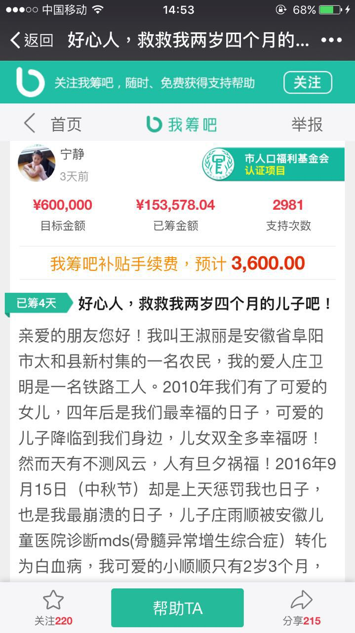 中铁员工我筹吧发起为白血病患儿筹款救命,2500余名员工爱心接力