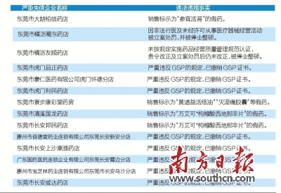 在8日公布的《2016年药品经营单位失信企业名单》里,东莞共有54家企业被定为失信企业,违法违规事实涉及未凭处方销售处方药、超范围经营处方药等,其中17家药店被查出销售超过有效期的劣药。另外值得注意的是,54家企业中“东莞市仁正医药有限公司”出现的频率最高,共有大朗松佛路、横沥新城、黄江裕元等七家分店被列为失信企业。