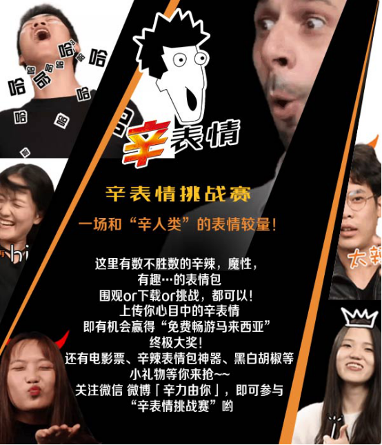 关注微博、微信「辛力由你」,即可免费下载这些火爆的辛表情;还可以参与“辛表情挑战赛”,和朋友们来一场表情较量。你将有机会赢得“畅游马来西亚”的大奖,以及电影票,话费等小礼物哟~
