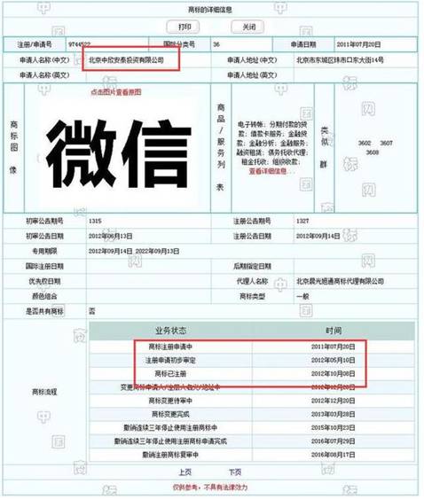事实真是这样吗?在国家工商总局官网商标查询系统中,关于“微信”在第36类金融服务商标里,确有中欣安泰的注册信息,该信息显示中欣安泰的商标申请日期是2011年7月20日,注册公告日期是2012年9月14日。