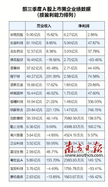 当然,并非每家上市莞企的业绩都是芝麻开花节节高,也有部分莞企因为行业周期等原因,出现盈利能力下滑。前三季度净利润下滑的公司包括锦龙股份、宜安科技和惠伦晶体等。