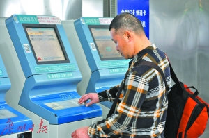如今,10台自动售票机移到了以前的人工售票窗口位置,而6台互联网自助取票机则紧邻其旁。由于人工售票窗口已移到该站出站口旁,因此,自动售取票的等候区域相比原来有所扩大。昨日上午11点,来购票的旅客并不算多,平均每人只需要1分钟左右,便可以完成整个自助购票流程。