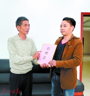 “阿叔,太感谢您了!我替我儿子谢谢您。”近日,在厚街镇沙塘社区居委会发生了爱心一幕,沙塘居民平叔知道双岗小学的学生邓力豪患了白血病后,主动将别人捐给他女儿治病的善款11.8万元转捐给了邓力豪,邓力豪父亲连声感谢。今年7月,平叔的女儿叶美合因患白血病而去世。平叔希望将爱心继续传递下去,让另外一个生命渡过难关。