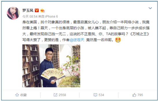 是因文爱上作者,还是因为作者喜欢上了《万域之王》已无从考证。凤姐新微博中一改往日“泼辣”的文风,对该书与作者极尽讨好:“身在美国,找个对象真的很难,最是寂寞女儿心,朋友介绍一本网络小说,我竟然看上瘾!聂天,一个出身底层的小孩,被人瞧不起,靠自己努力一步步成长强大,最终发现自己独一无二,这说的不正是我、你、TA的故事吗?《万域之王》写得太赞了,更赞的是,作者@逆苍天 竟然是一名帅哥!”