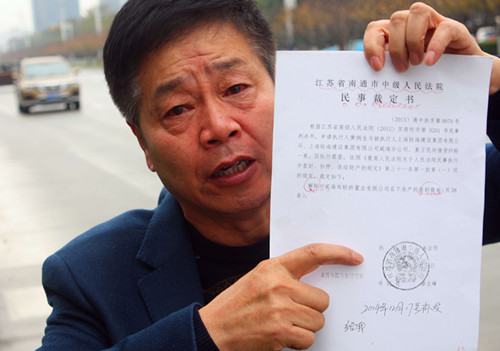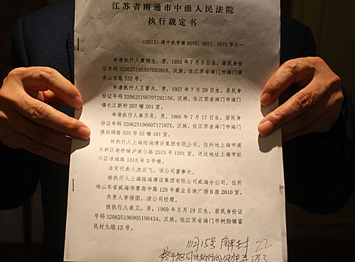 (黄炳生手持2013年5月7日,“南通中院”作出的《民事裁定书》向记者介绍情况)