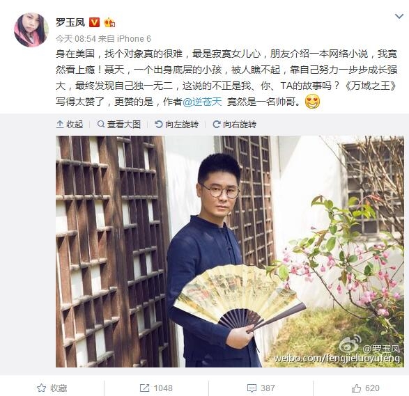 11月30日,凤姐一条微博再引争议,吐槽在美国找对象太难,因为寂寞喜欢上了网络文学,并“调戏”起网文大神逆苍天。“《万域之王》写得太赞了,更赞的是,作者@逆苍天 竟然是一名帅哥!”