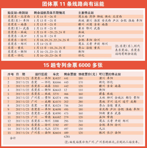 团体票、专列票,都还有票!前者11条线路运能尚足;后者15趟火车余票6000多张——两者皆去往皖、赣、鄂、苏、豫、渝、湘,这已覆盖了东莞大部分外来工的过年返乡之路。