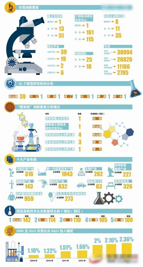 12月9日至11日,2016中国(东莞)国际科技合作周在东莞举办。市科学技术局在本次合作周上发布了“东莞创新地图”。打开这份创新地图,既可以看到十大产业的企业数量和分布情况,也可以看到东莞创新要素的各项数据,其中,创新地图收录的我市国家高新技术企业已达到1508家。