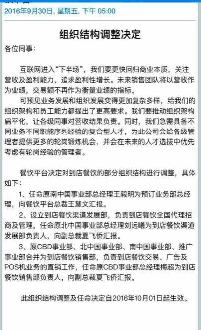 ¡¡¡¡½ñÄê7Ô£¬ÃÀÍÅ´´Ê¼ÈËÍõÐË·¢±íÄÚ²¿½²»°£¬³ÆÃÀÍÅ·¢Õ¹½«½øÈë“ϰ볡”¡£Ëû̹³ÐÃÀÍÅ֮ǰµÄ“Éϰ볡ģʽ”£¬¾ÍÊÇÃÍ×¥Óû§¡¢ÃͽÓÉÌ»§£¬È»ºó×ö“ÓªÏú½»Ò×”Õâ±È½Ï±¡µÄÒ»²ã¡£ÔÚ9ÔÂ30ÈÕ£¬ÐÂÃÀ´óÓÖÔÚÄÚ²¿ÓʼþÖбíʾ“»Ø¹éÉÌÒµ±¾ÖÊ£¬¹Ø×¢ÓªÊÕ¼°Ó¯ÀûÄÜÁ¦£¬ÏúÊÛÍŶӽ«ÒÔÓªÊÕ×÷Ϊҵ¼¨”¡£