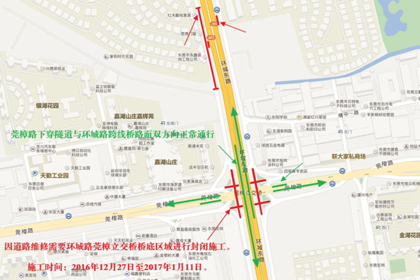记者日前从东莞市城市综合管理局获悉,因道路维修需要,2016年12月27日凌晨至2017年1月11日,环城路莞樟立交桥桥底区域道路将进行封闭施工, 莞樟路下穿隧道及环城路跨线桥路面双方向正常通行。