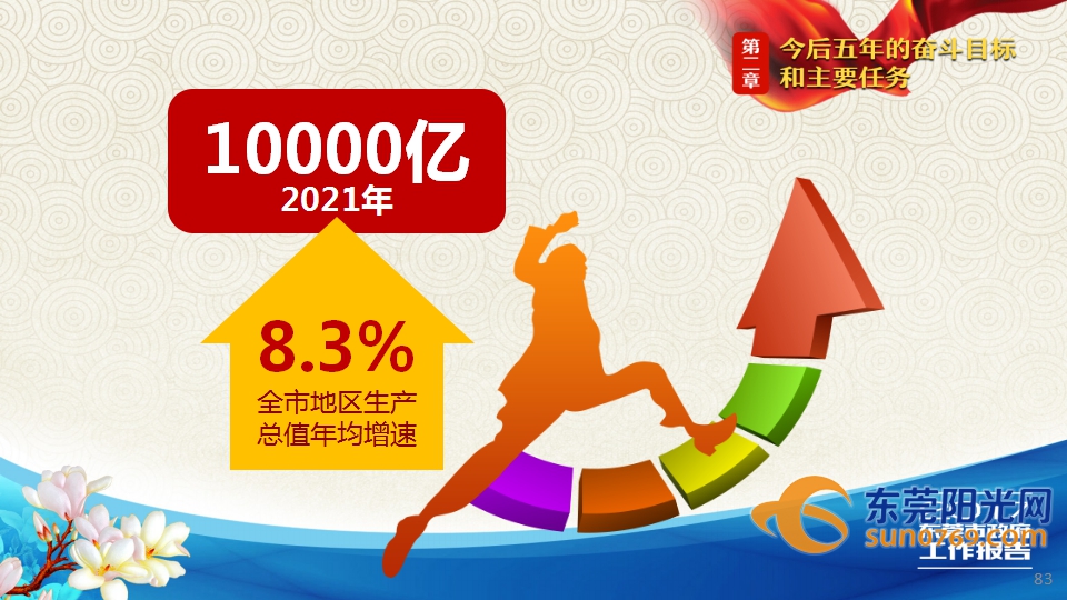 报告指出,今后五年,是东莞加快经济转型、实现动能转换的决胜时期,也是东莞加速城市升级、促进和谐善治的关键时期。力争未来五年,全市地区生产总值年均增速达到8.3%以上,到2021年超过万亿元,东莞的综合实力与城市地位进一步提升,继续处在全国地级市前列。