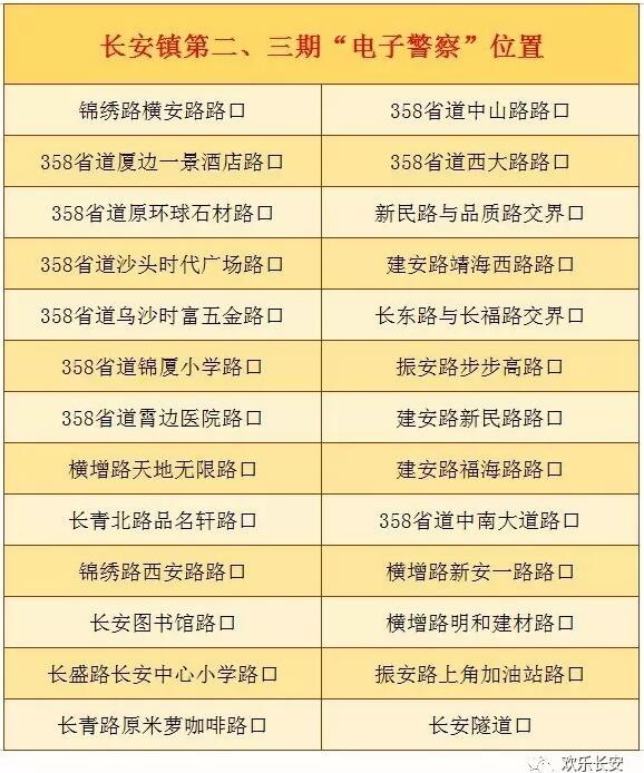 自去年8月以来,长安镇在中心区和省道的部分交通灯口前加装了一些支架,安装了新的电子警察。本期新增的“电子警察”为长安镇第二、三期电子警察系统,共新加装26组高清监控设备。其中,抓拍冲红灯等违法行为的有24组,测速的有2组,测速的路口为长安隧道双向的两组。