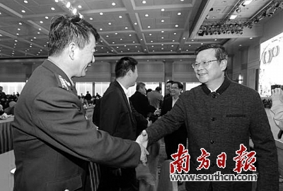 17日,东莞举行2017年社会各界人士新春茶话会。图为市领导吕业升、梁维东等向与会代表送上新春祝福。 记者 孙俊杰 摄