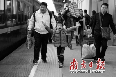 14日,东莞东火车站,小朋友即将上车回家,显得很高兴。记者 孙俊杰 摄