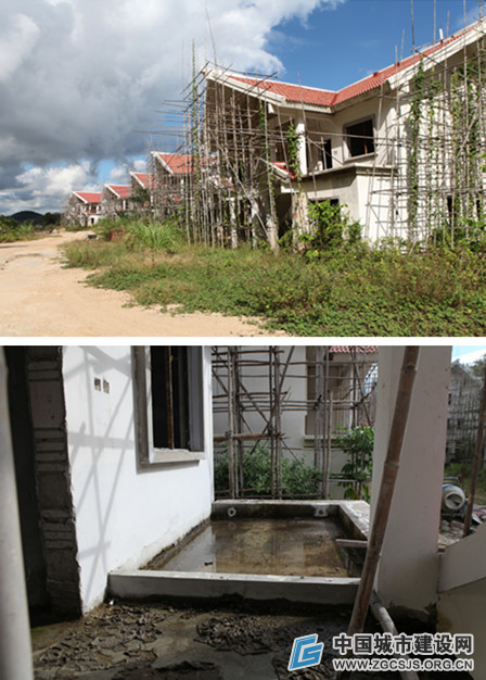 记者在现场看到28栋安置房主体已基本完工,外围架子还未拆除,歪歪斜斜,房屋周围杂草横生。还有部分剩余的钢材堆放在施工现场,其表层已是锈迹斑斑,明显搁置已久。靠近山脚处有一排铁架子,架子上还有少部分未脱落的“规划前景”及“全国农村土地产权制度改革与建设试点项目”介绍字样。