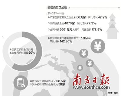 自2015年4月21日挂牌以来,随着外商投资负面清单模式、国际贸易单一窗口等一系列改革措施的出台,广东自贸试验区作为开放程度最高、营商环境最优越的地区,极大地增强了我省对高质量外资的吸引力。去年1—11月,广东自贸区新设立企业7.06万家,同比增长42.9%。其中,外商投资企业4070家,同比增长77.3%;合同外资3661亿元人民币,同比增长172.8%。自贸区吸引合同外资占到全省同期总额超60%。