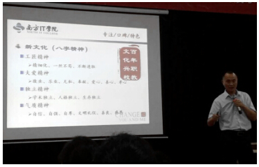 在南方IT学院即将迎来建校20周年之际,曾凡明大校长提出了 “百年职教、文化兴校”的全新目标,以新8字精神和“四心四守”来重塑学院文化,提高教师的成就感、荣誉感和幸福感,让教育工作“回归本质、回归本性、回归人性”,使校园成为师生心灵提升的地方。
